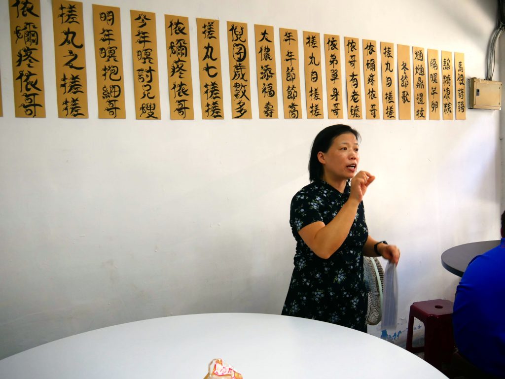 除此之外曉穎老師也與我們分享她多年來書寫鳥蟲體的心得,牆上也有展示以鳥蟲體書寫的菜單內容以及馬祖的冬節歌,曉穎老師也笑說馬祖語言的韻調就像鳥蟲體裡的鳥鳴一般,婉轉清亮。冬節歌的歌詞傳達了馬祖人在冬節時期團聚搓湯圓的畫面,但也從冬節歌中的依哥、依弟以及明年暝抱細哥這些細節,也看出馬祖早期重男輕女的社會觀念。
